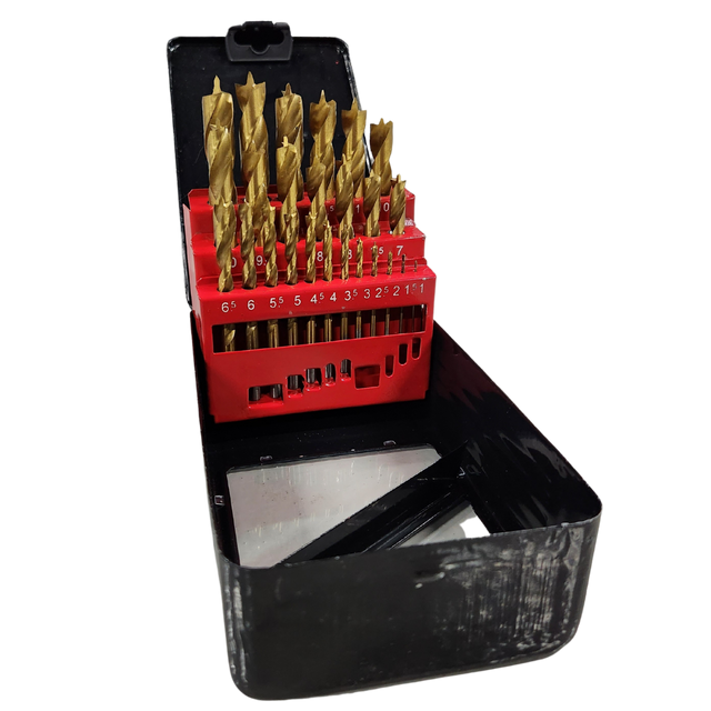 Set includes 25 brad point drills from 1mm to 13mm in size in 0.5mm steps.