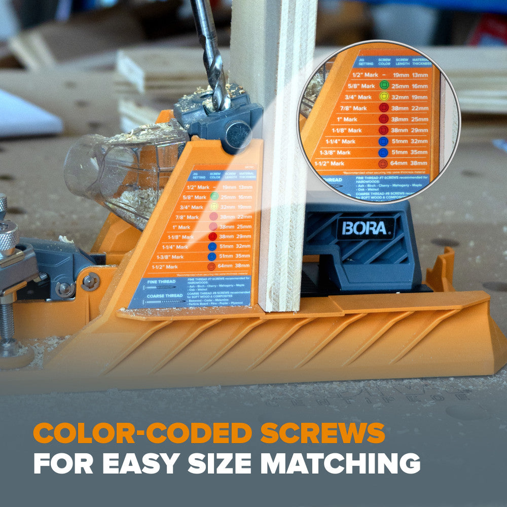 The BORA Auto-Adjust clamp allows you to clamp varying thicknesses without readjusting. Simply put your workpiece into the patented Armor Auto-Adjusting Clamp and the Auto-Jig will do the rest. The colour-coded screw system with Armor Tools Colour-Coat technology makes it easy to match the screw size and head to the thickness and depth of the pocket hole, while the colour coating itself offers anti-corrosive protection to your workpiece.