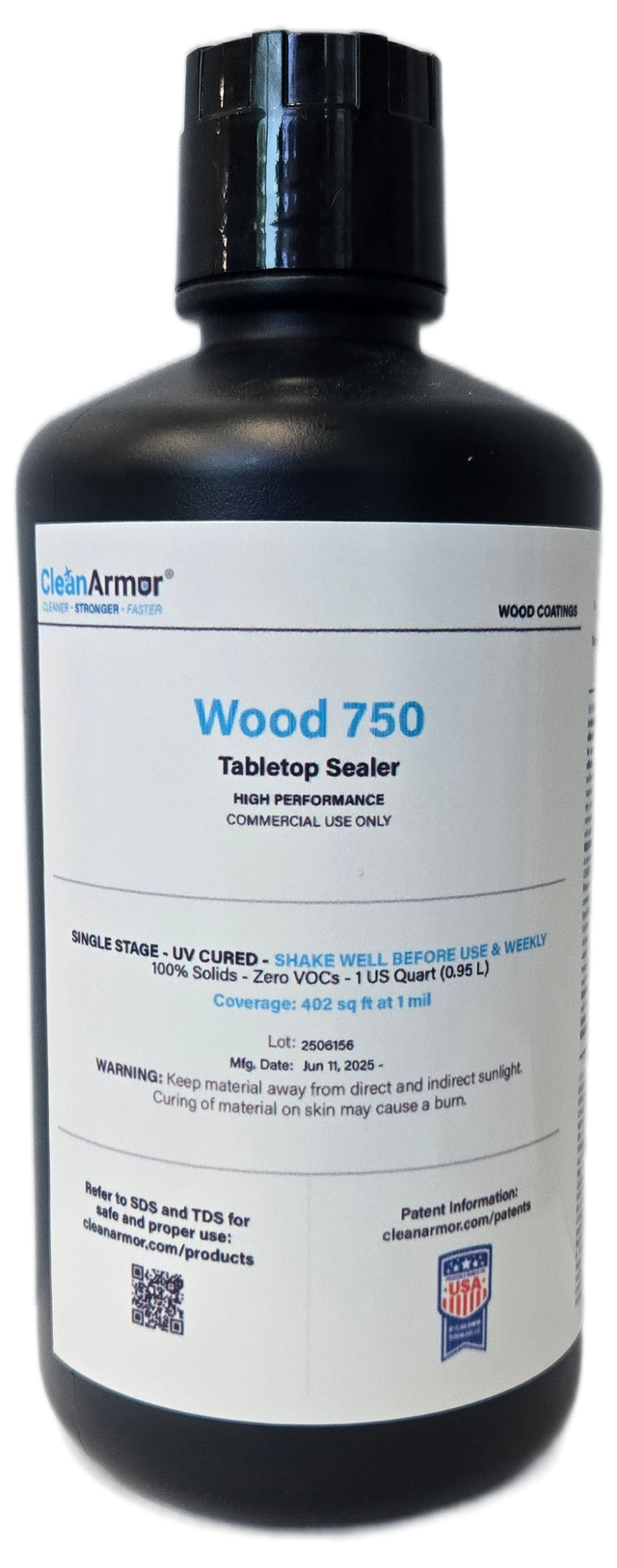 Clean Armor Wood 750 is a UV-curable commercial tabletop sealer specifically engineered for production use in the hospitality and commercial furniture industries. It provides exceptional clarity, adhesion, and holdout, forming the ideal foundation for durable, high-traffic tabletop finishes. Designed for use on new wood substrates and paired with the Clean Armor 757 Commercial Tabletop Finish, it delivers long-lasting protection and a flawless base for top coats.