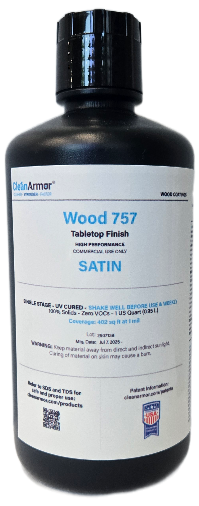 Clean Armor Wood 757 is a UV-curable commercial tabletop finish engineered for professional production environments and the hospitality industry. Designed for high-traffic use, it provides exceptional resistance to chemicals, heat, abrasion, scratches, and impact. Suitable for wood and synthetic substrates, this thin-build, low-profile finish ensures durability and clarity while maintaining an elegant, professional surface. Visually this finish is comparable to traditional or hard wax oil finishes.