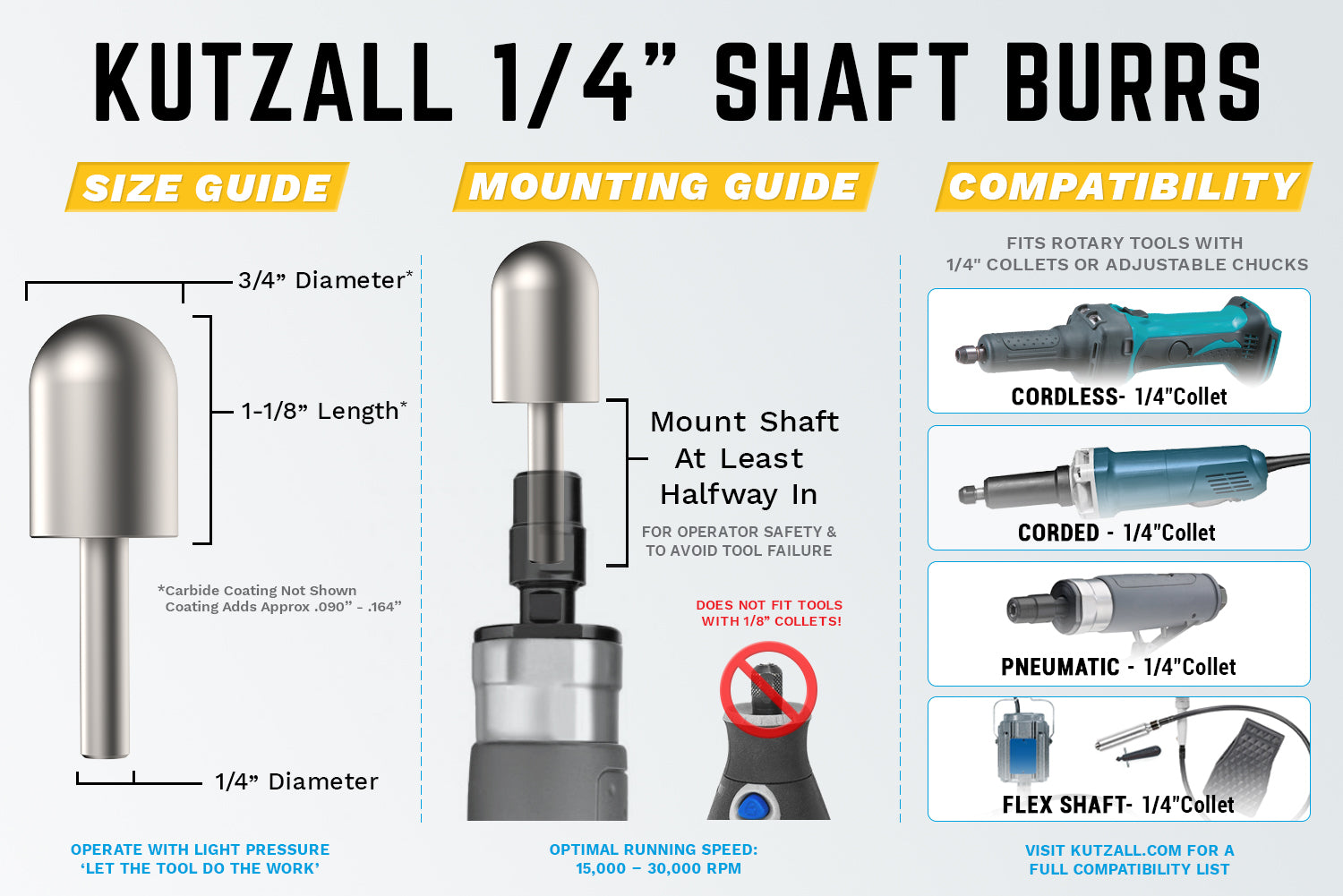 Use only with rotary tools equipped with correctly sized collets or an adjustable chuck (1/4 inch or 1/8 inch depending on model). Do not mount these burrs on incompatible tools.