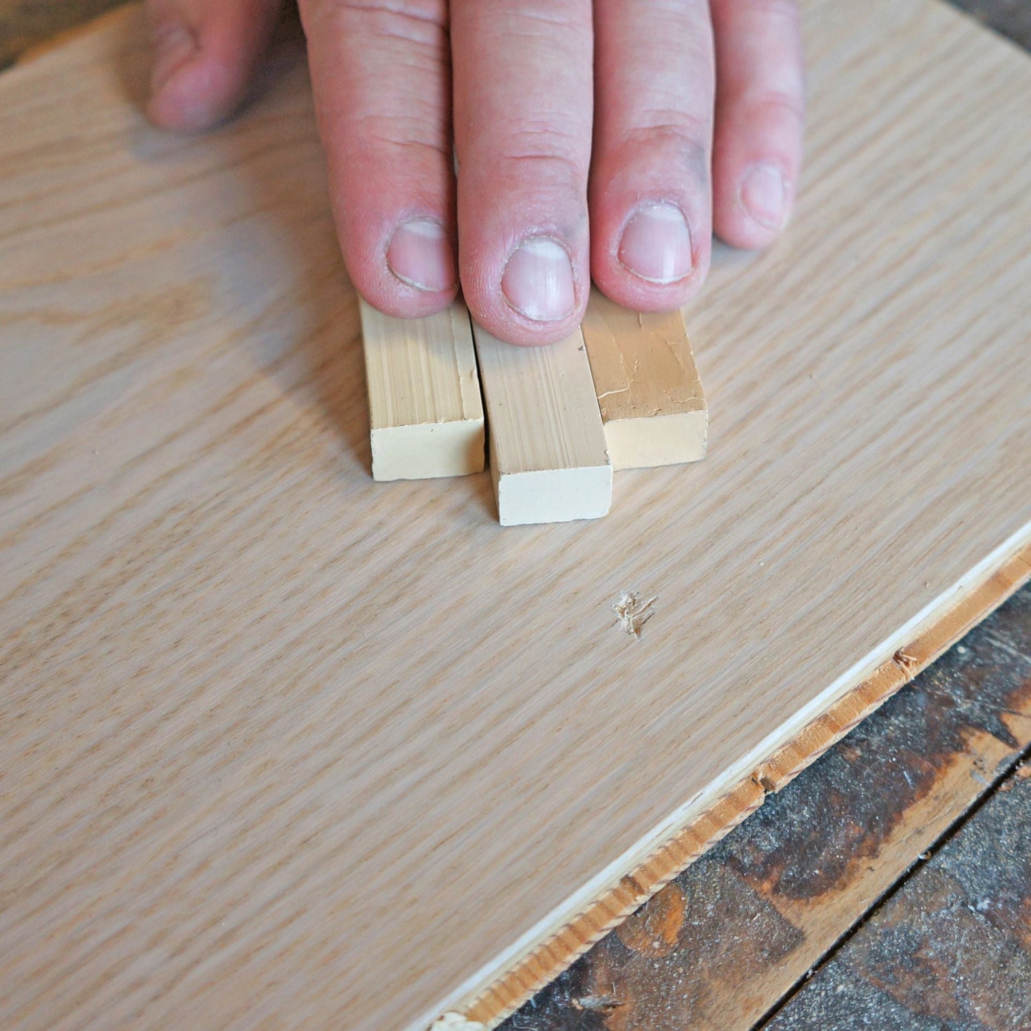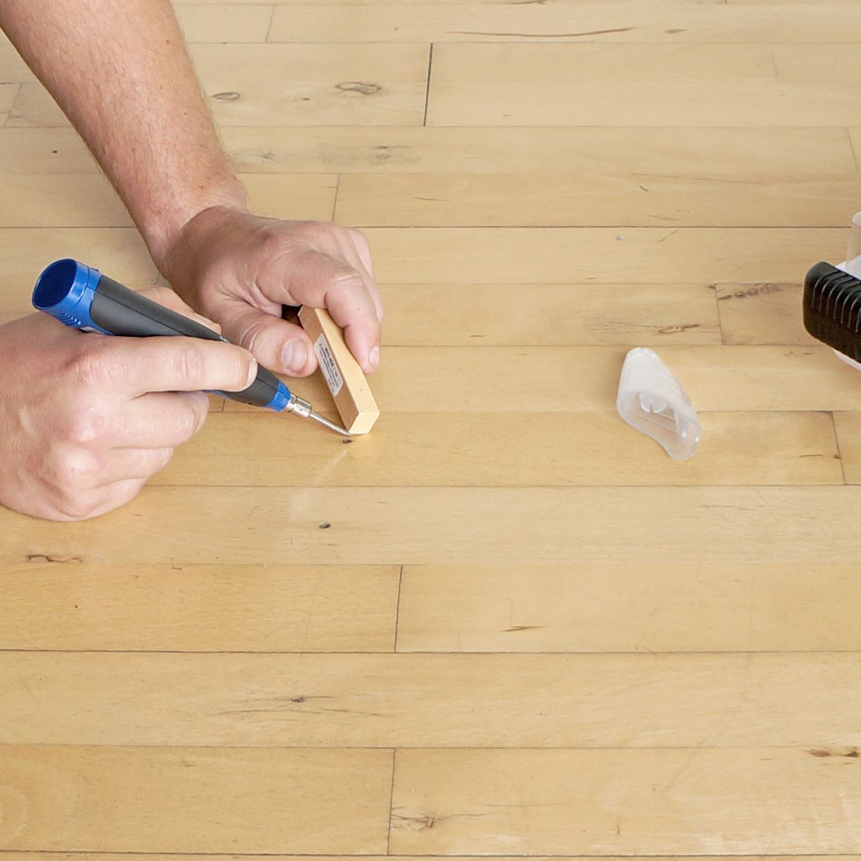 Use a Battery melter to melt hard wax into the defect. Use a Leveling tool or scraper to remove excess wax when the wax has hardened. The Hard Wax Kit includes eight different wood tones plus black and white.