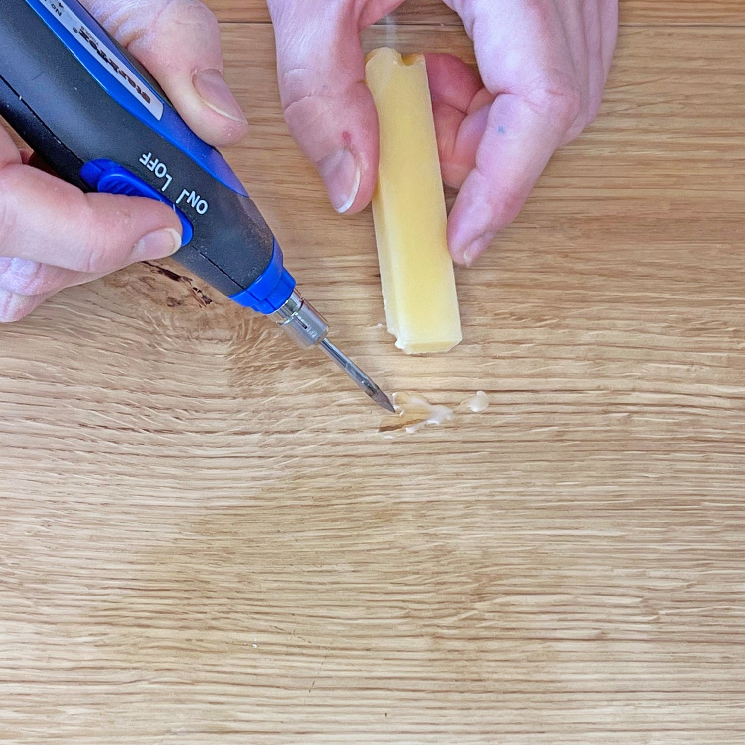 1. Hard wax is perfect for filling smaller knots, scratches and cracks in wood.2. Choose a color and use a battery melter to melt the hard wax into the damage.