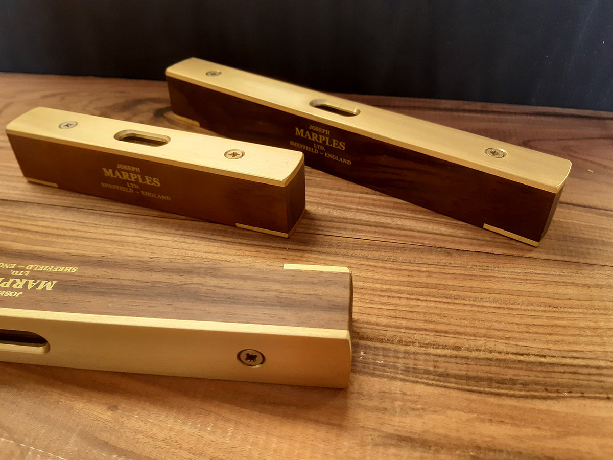 Joseph Marples currently manufacture two sizes of spirit level, 6" (150mm) and 9" (225mm), based on traditional designs. Both have full length upper brass plate and lower brass tipped ends. The body is made from the best quality rosewood or walnut.
