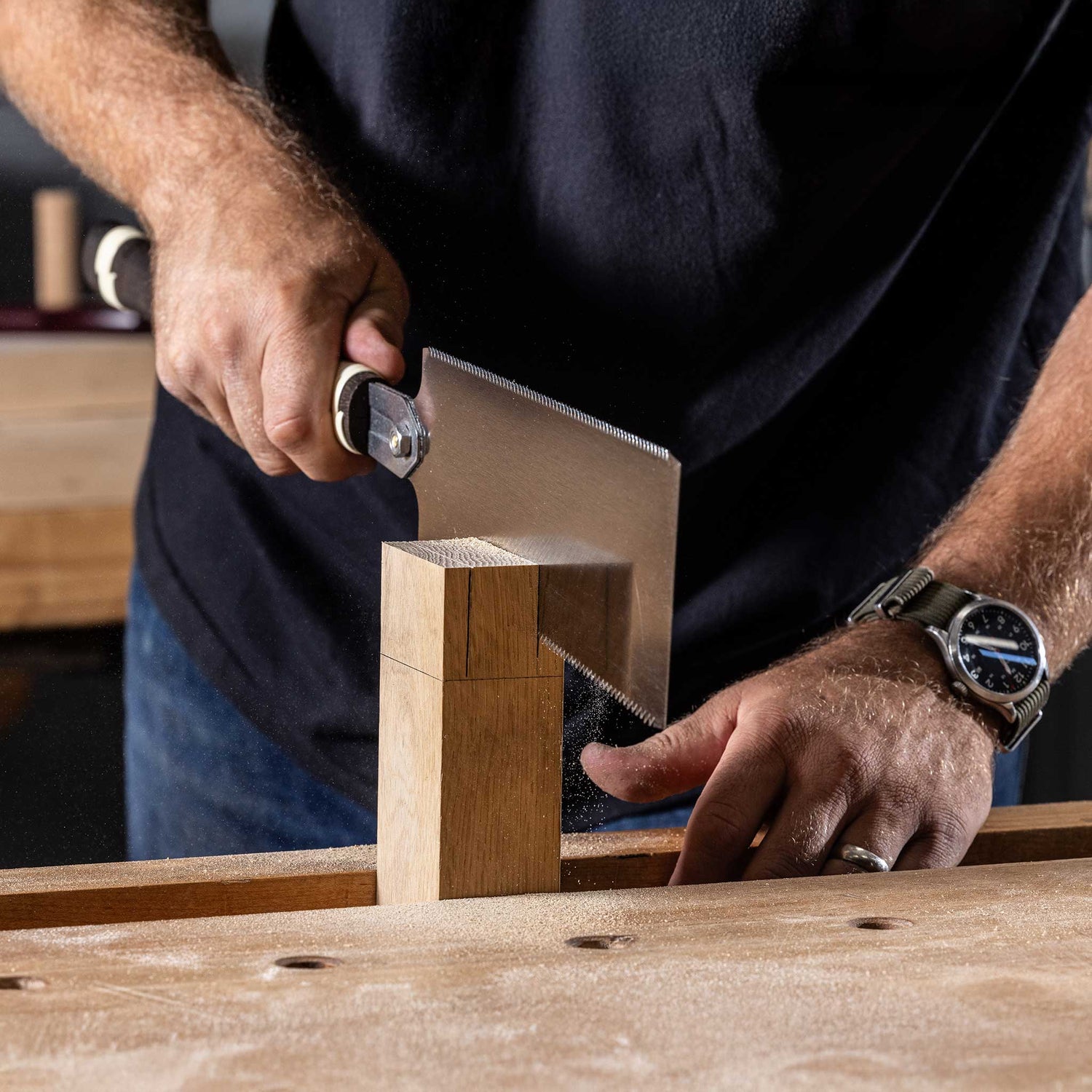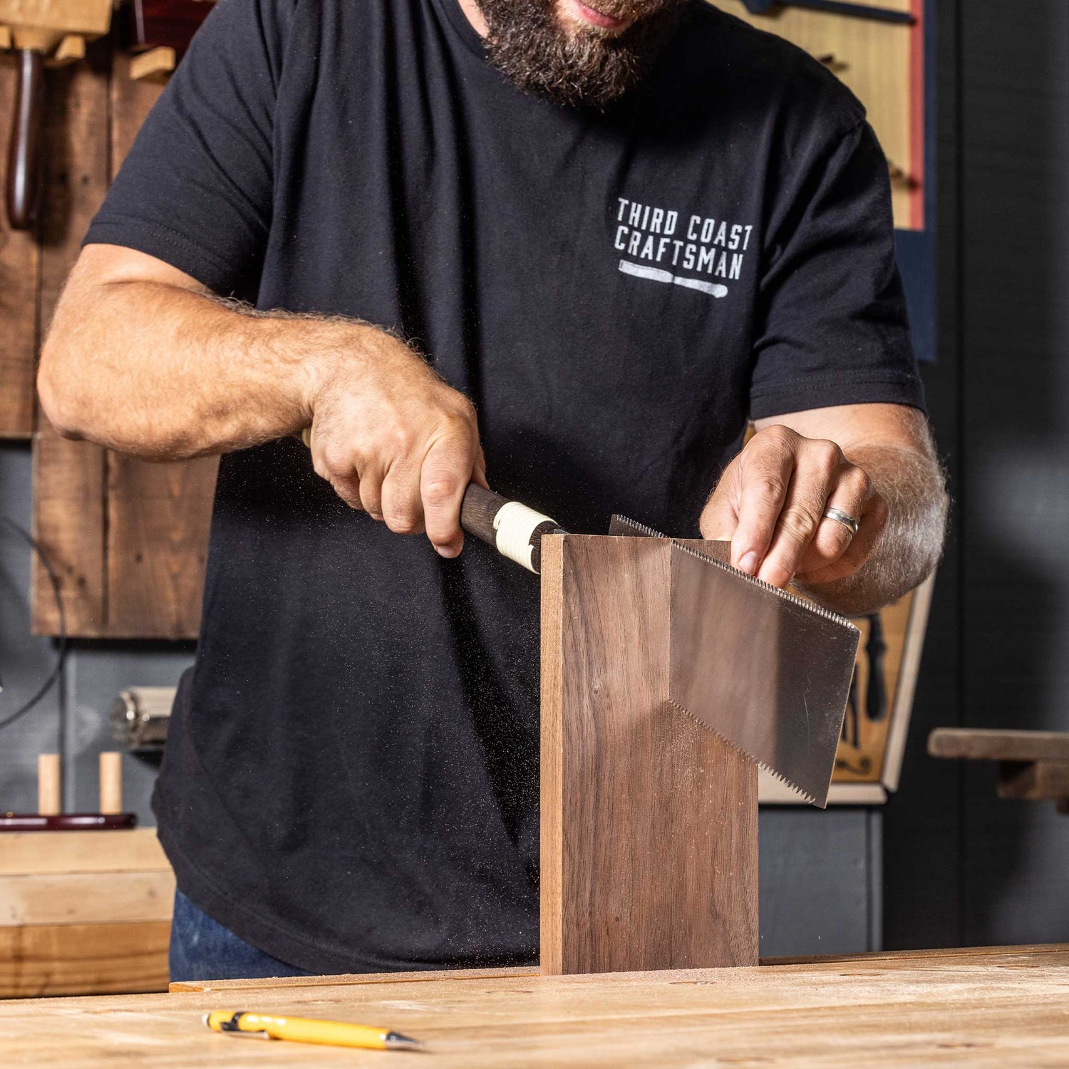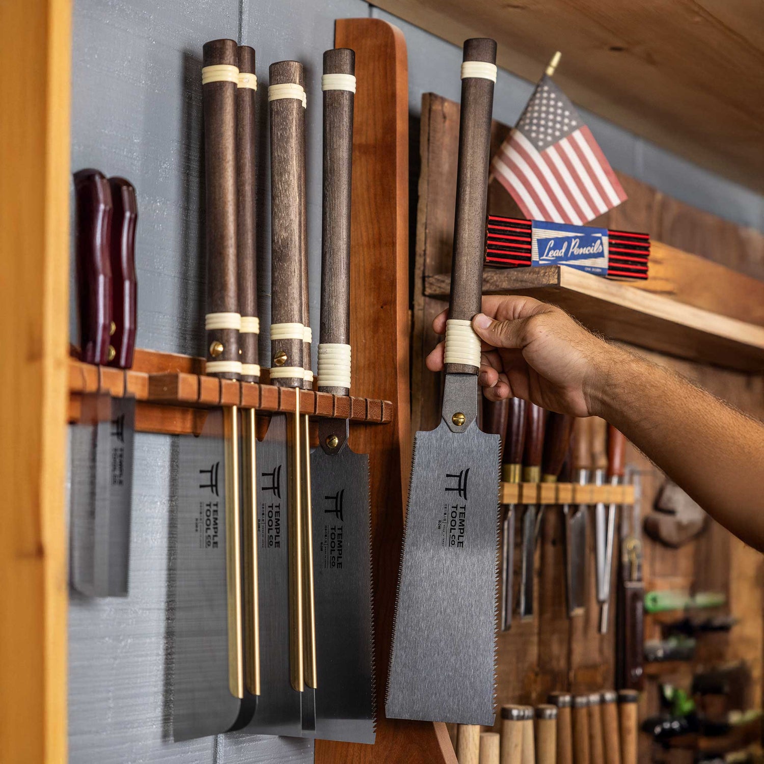 The Temple Tool Co. Ryoba features a 240mm (9.5”) SK85 Japanese tool steel blade, considered the standard size for general-purpose use. We have carefully designed the TPI and tooth geometry to deliver exceptional balance, making this saw equally effective at resizing stock and tackling medium to large joinery. The 0.48mm (0.019”) thin blade ensures accuracy without compromising strength, while premium brass hardware allows for simple blade replacement when needed.
