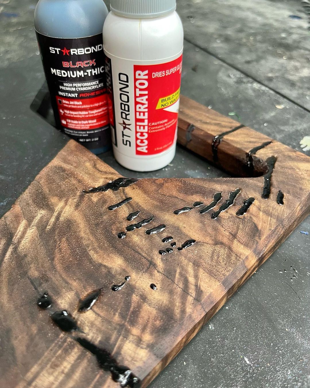 The go-to black CA glue for those with knot problems in their wood. Known for flawless knot and void fills, this rubber-toughened formula flows thick (500–600 cps), stays put, and cures to a deep jet-black finish that elevates every piece.