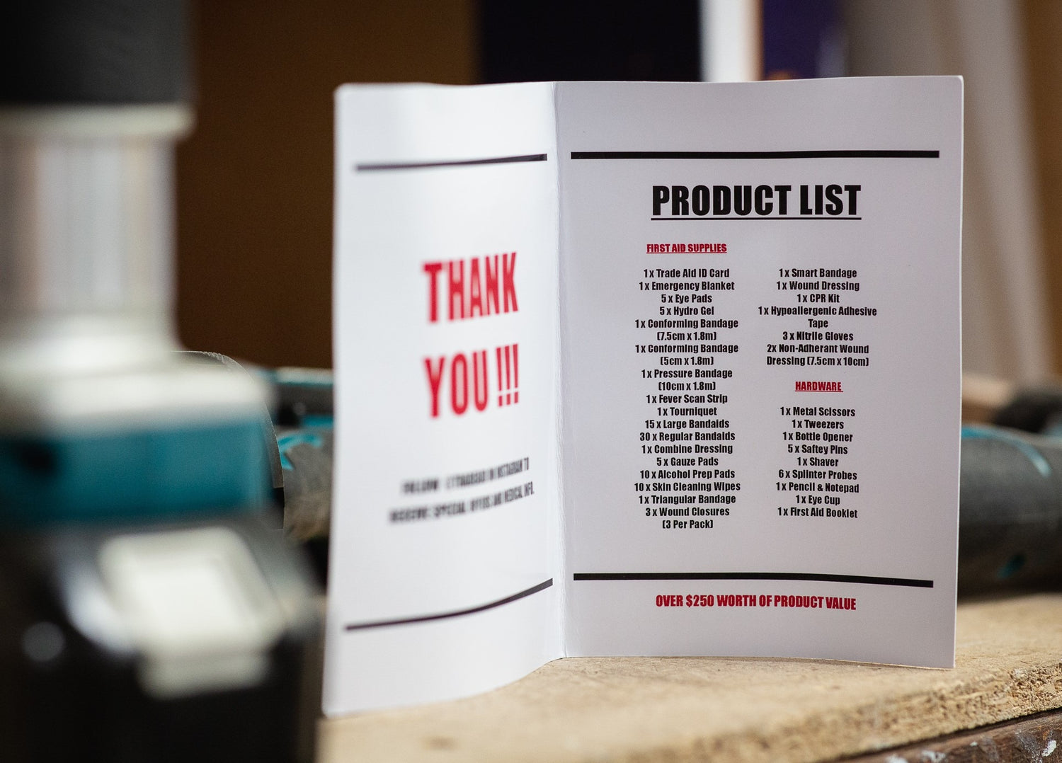 - Your first aid supplies are specific to tradies, they are labelled neatly and arranged so that they zip away and everything is secured in place within the kit (the kit can now get thrown around).