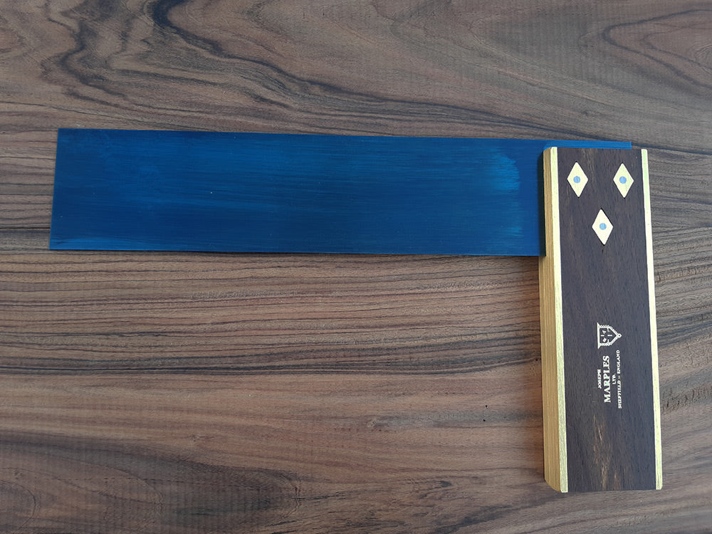 The squares have 1/8th inch thick machined brass on both the inside and outside faces, thus ensuring accuracy on the inside and outside edges. They have a blued spring steel blade, secured to the stock with brass diamond washers and steel rivets. The accuracy of the try squares is well within that required by BS3322.