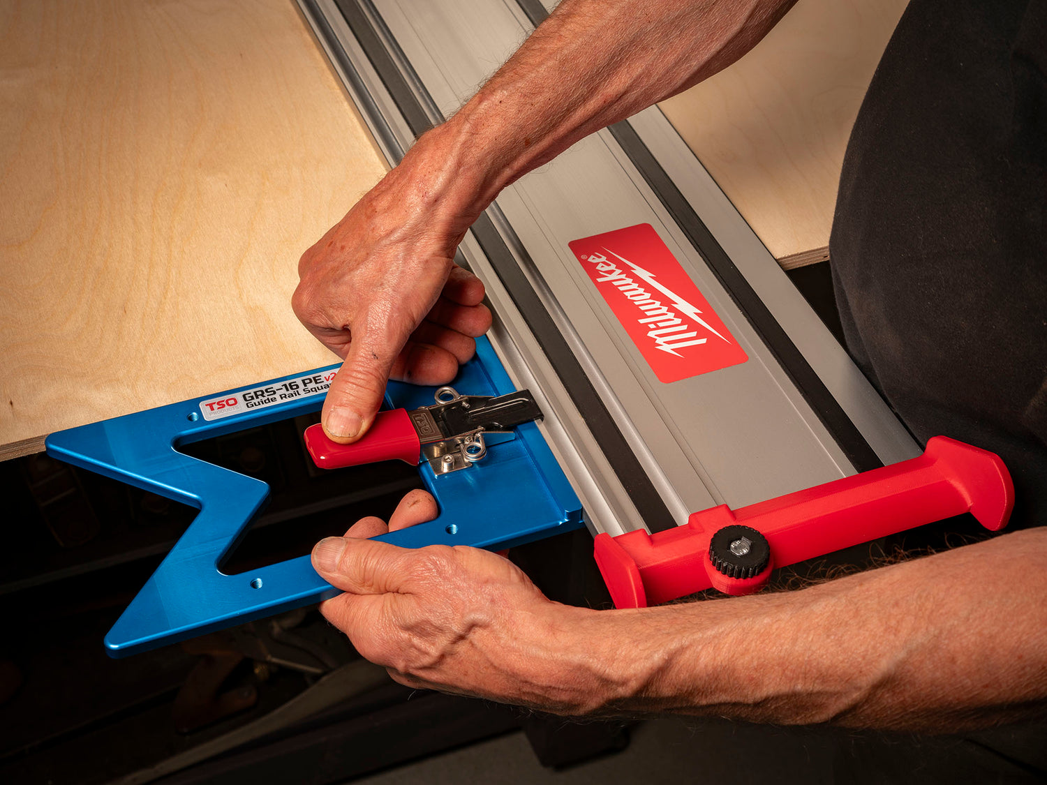 The GRS-16 PE v2 Guide Rail Square is perfect for crosscuts on sheet goods and is compatible with Festool, Makita, Milwaukee, Powertec, Triton, and WEN track saw systems.